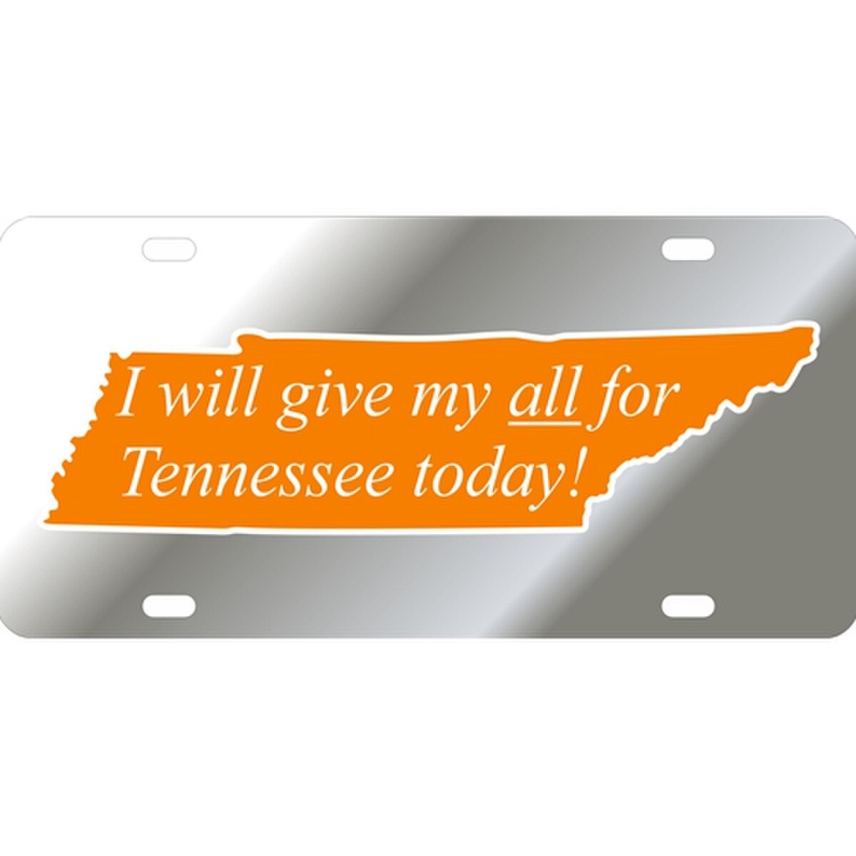 Show everyone on the roadways that you give your all for Tennessee with this license plate from Craftique! Made of acrylic and featuring the signature "I Will Give My All for Tennessee Today" saying inside of the state outline. Does not include mounting hardware.