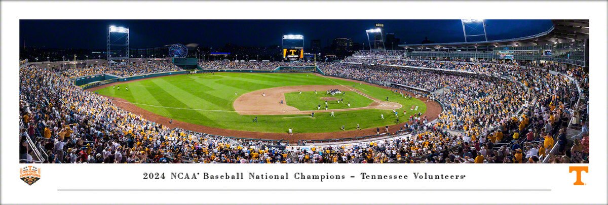 This panoramic photo, taken on June 24, 2024, showcases the celebration at Charles Schwab Field in Omaha, Nebraska, as the Tennessee Vols reveled in their victory after winning the 2024 College World Series. In a dramatic Game 3, the Vols held off an eighth inning surge to defeat Texas A&M 6-5, earning their first national title in program history. With the victory, the Volunteers also broke the curse, becoming the first #1 overall ranked team in the tournament to win the national championship since 1999.