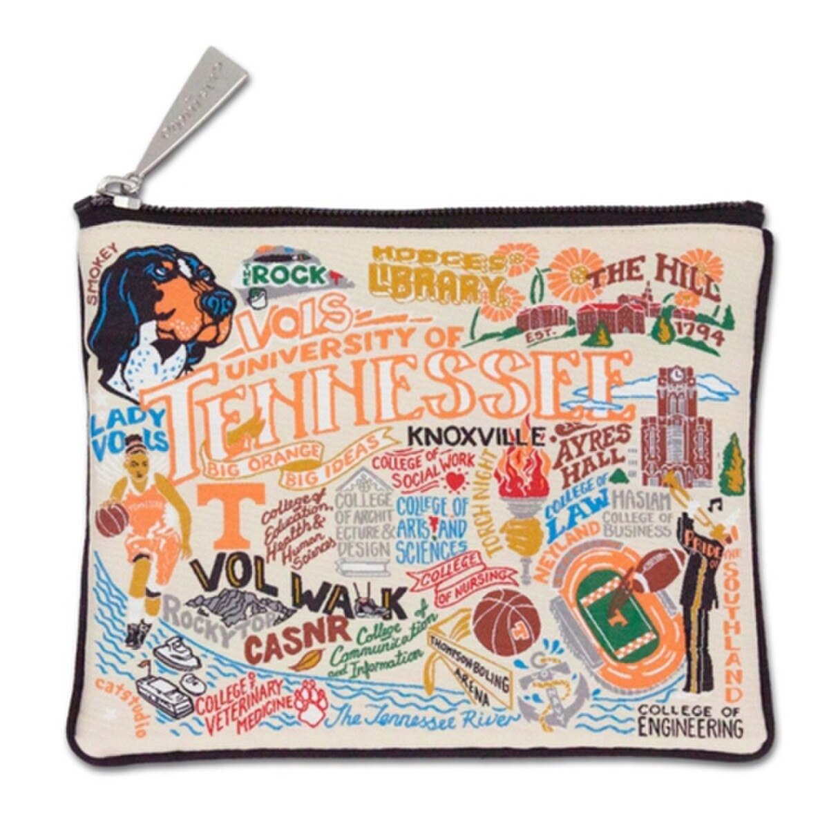 This original design celebrates the University of Tennessee. Go Vols! The design is colorfully woven into a handy-sized zip pouch - perfect for toting your keys, valuables, art supplies, cosmetics, and more! Complete with our signature collegiate-inspired black lining. 100% Polyester. Spot Clean. 7" x 5.5". Made in Thailand.